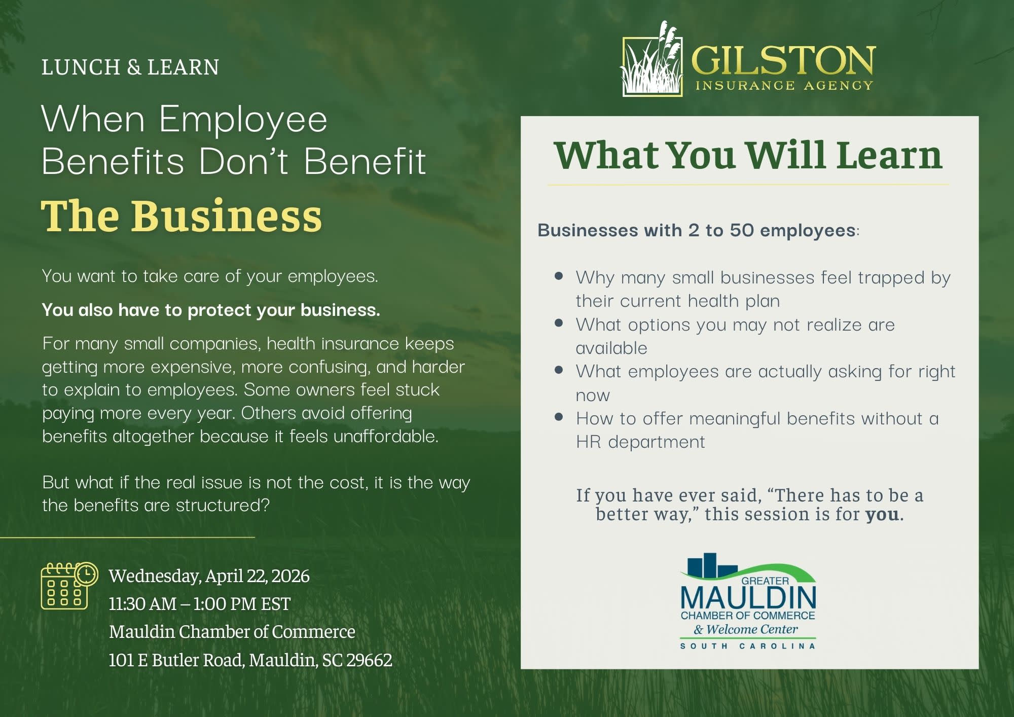 Please join Gilston Insurance Agency for a Lunch & Learn | When Employee Benefits Don’t Benefit the Business, with the Mauldin Chamber. Community & Chamber Members welcome!
