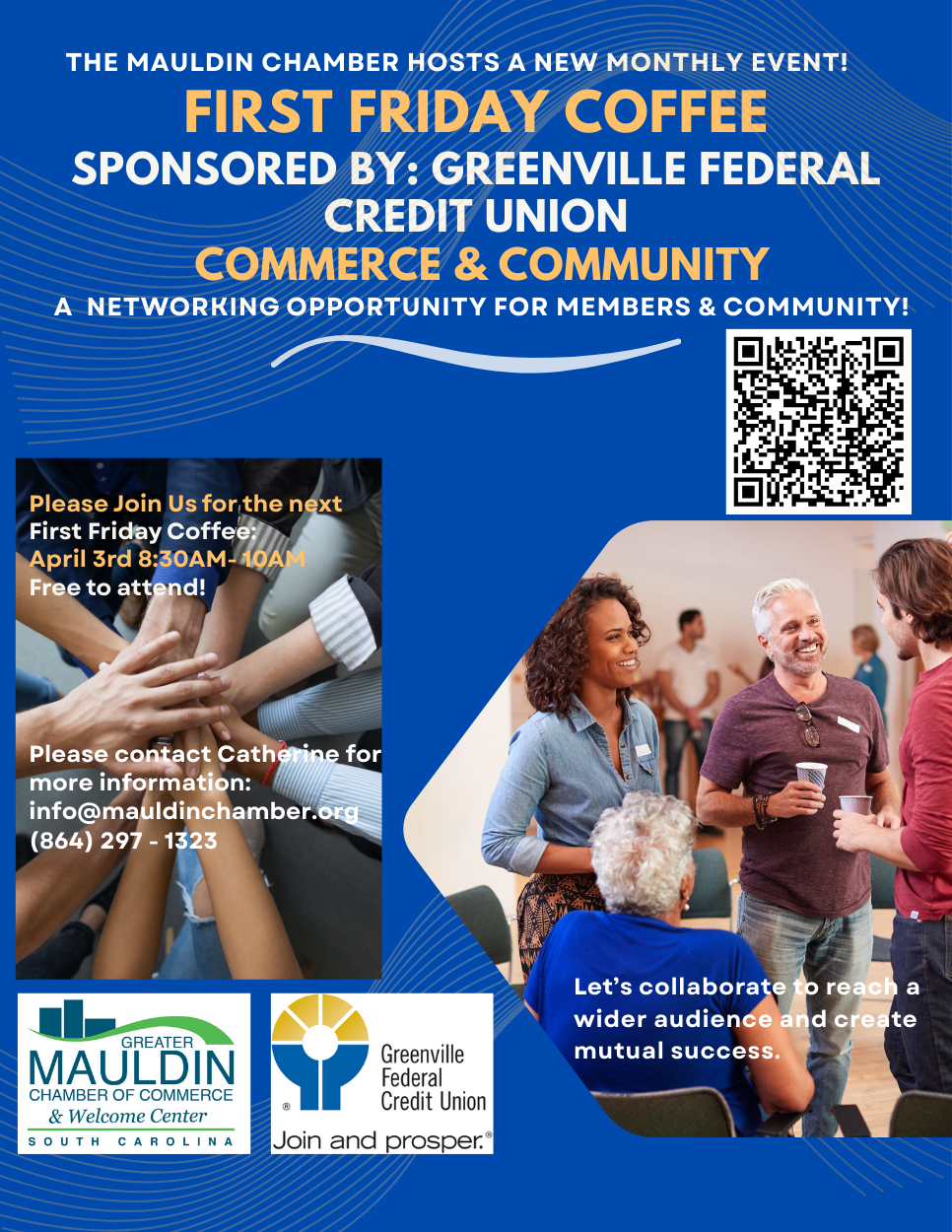 Please RSVP to join the Mauldin Chamber for First Friday Coffee A monthly networking event for Commerce & Community!