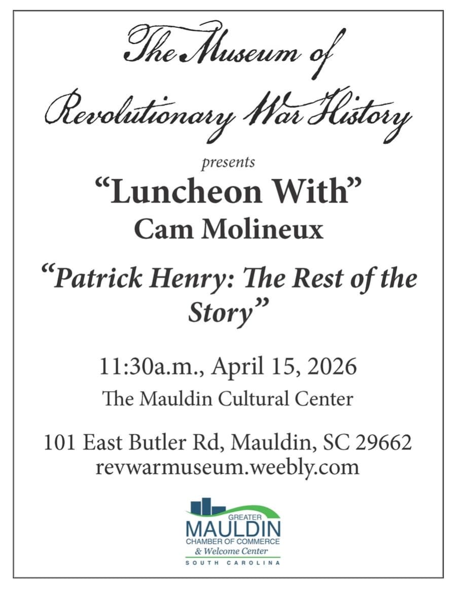 Patrick Henry: The Rest of the Story Beyond his seven immortal words, “Give me liberty or give me death,” what do you know about one of America’s most well-known Founding Fathers? His family? His career? Did he ever fail? Were there other speeches? Let this talk stretch your knowledge about this remarkable man. (And there's an interesting tie to South Carolina's Upstate.) Cam Molineux delights in telling true stories of the American Revolution—those of the heart and mind, rather than the battlefield. With family ties to key players, she unravels the past through their eyes, providing a personal and fresh perspective on history.