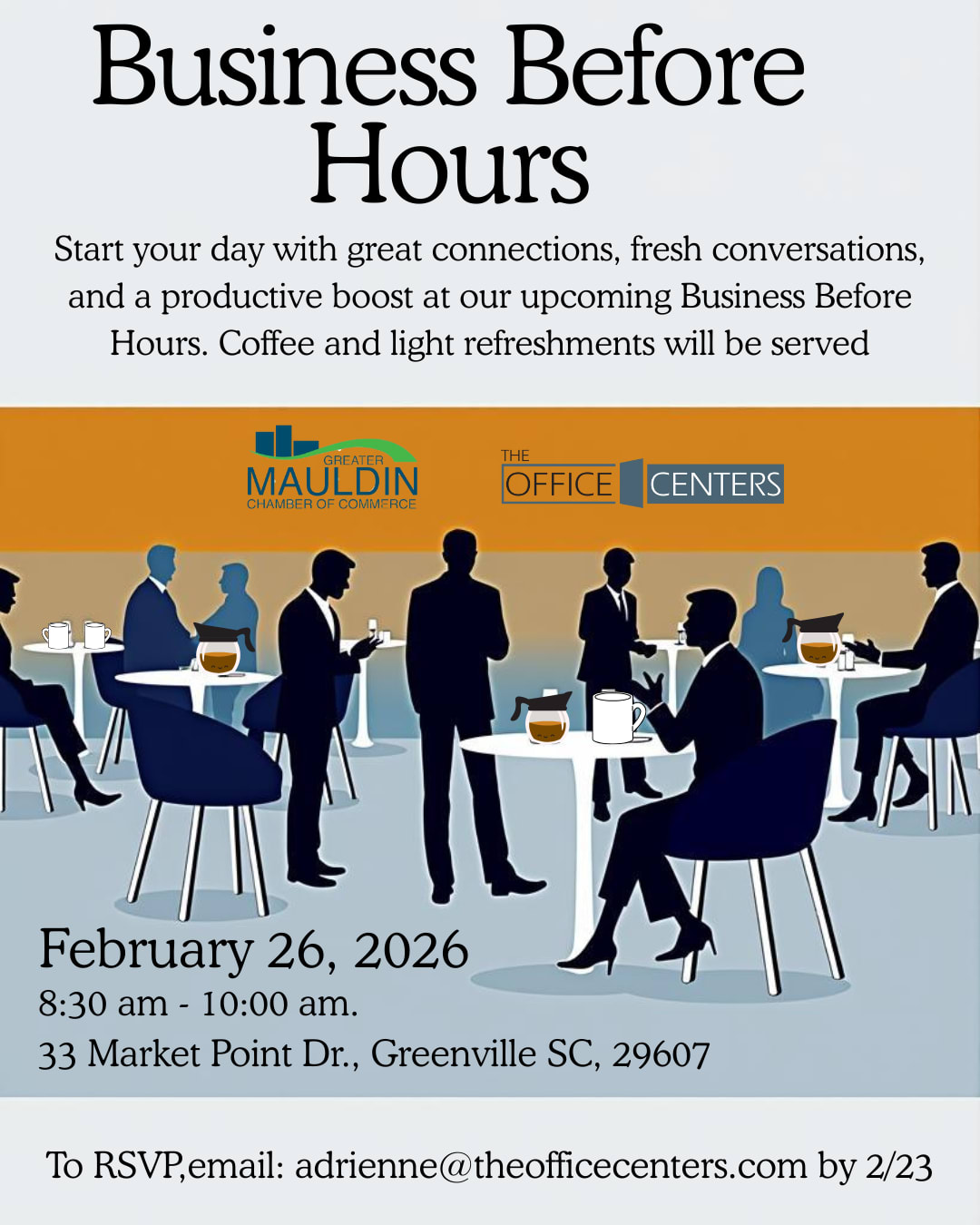 Please join the Greater Mauldin Chamber of Commerce for a Business Before Hours event hosted by, The Office Centers, at The Point location, as we highlight their beautiful space and business! Enjoy networking, coffee & light refreshments will be served. Tours will be provided to view their professional, executive suites, conference rooms, new co-lab and day spaces!