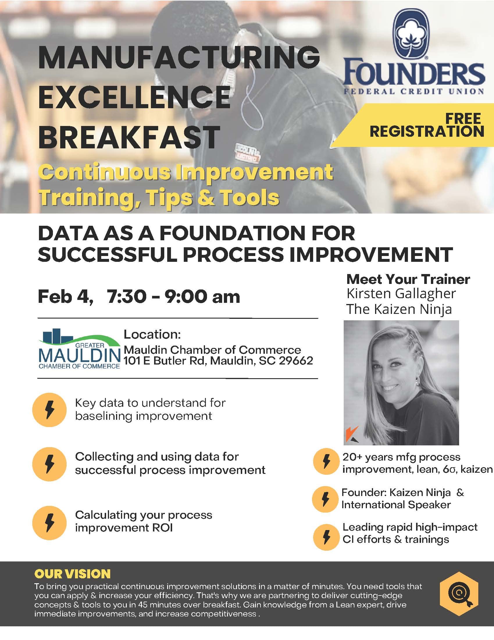 Please join the Mauldin Chamber as we begin our 2026 quarterly Manufacturing Roundtable Breakfast series facilitated byKirsten Gallagher of Kaizen Ninja, presented by Founders Federal Credit Union! This Quarter's topic: tba