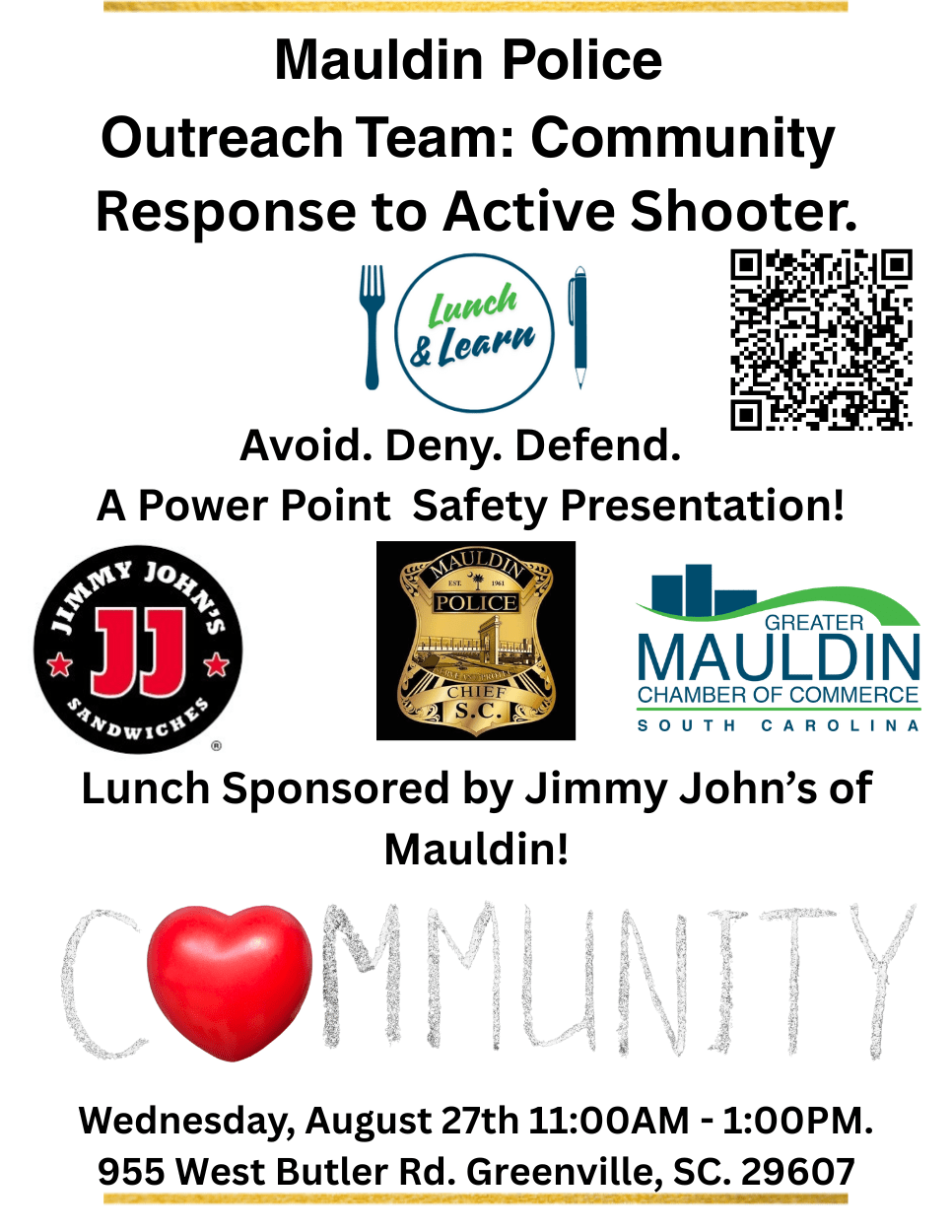 Please join the Mauldin Police Community Outreach Team for Community Response to Active Shooter training. Educate yourself and heighten your awareness during this informative Lunch & Learn opportunity!