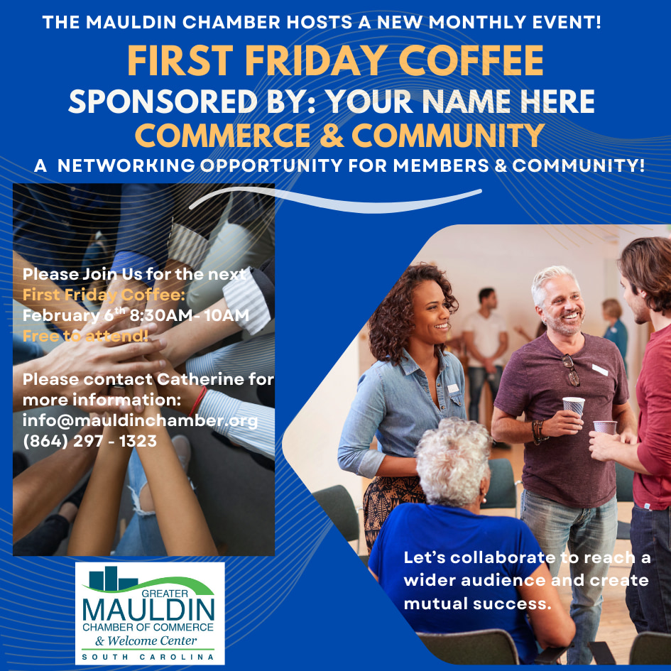 Please RSVP to join the Mauldin Chamber for First Friday Coffee A monthly networking event for Commerce & Community!