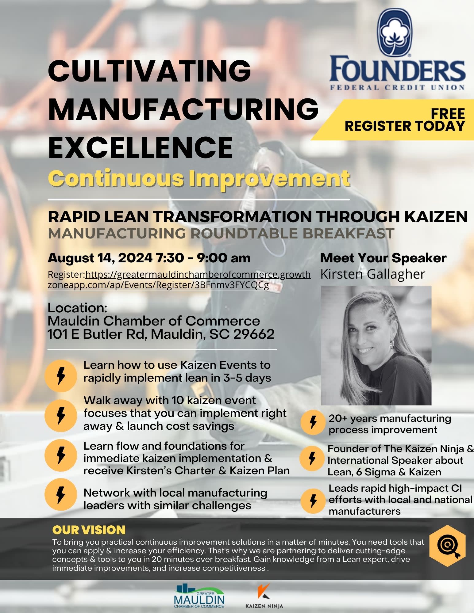 Join the Mauldin Chamber as we begin our quarterly Manufacturing Roundtable Breakfast series presented by Founders Federal Credit Union!