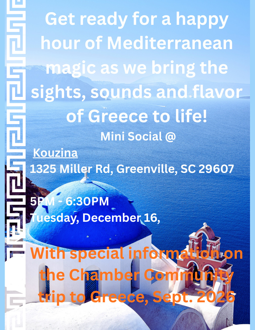 Go global with the Mauldin Chamber & discover Greece with us! Experience our community travel opportunity during this social! With trip details provided by: Zimpfer Travel Group with Dream Vacations, Ευχαριστώ Andy!