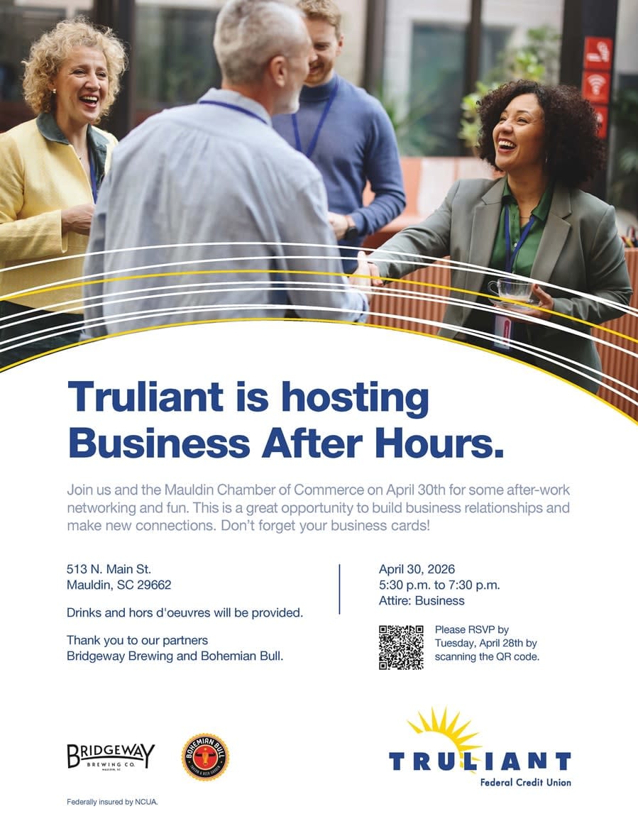 Learn about Truliant in an engaging evening to network and deepen your relationships with local businesses in the Mauldin community while learning what makes Truliant special and why they are committed to providing information that will improve your life and strengthen your financial position.
